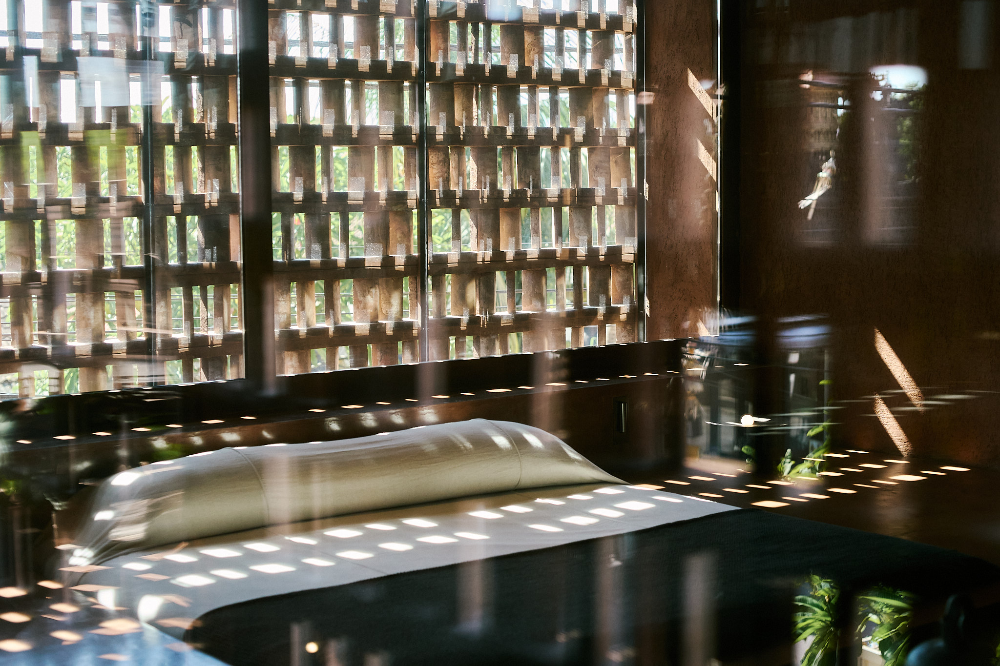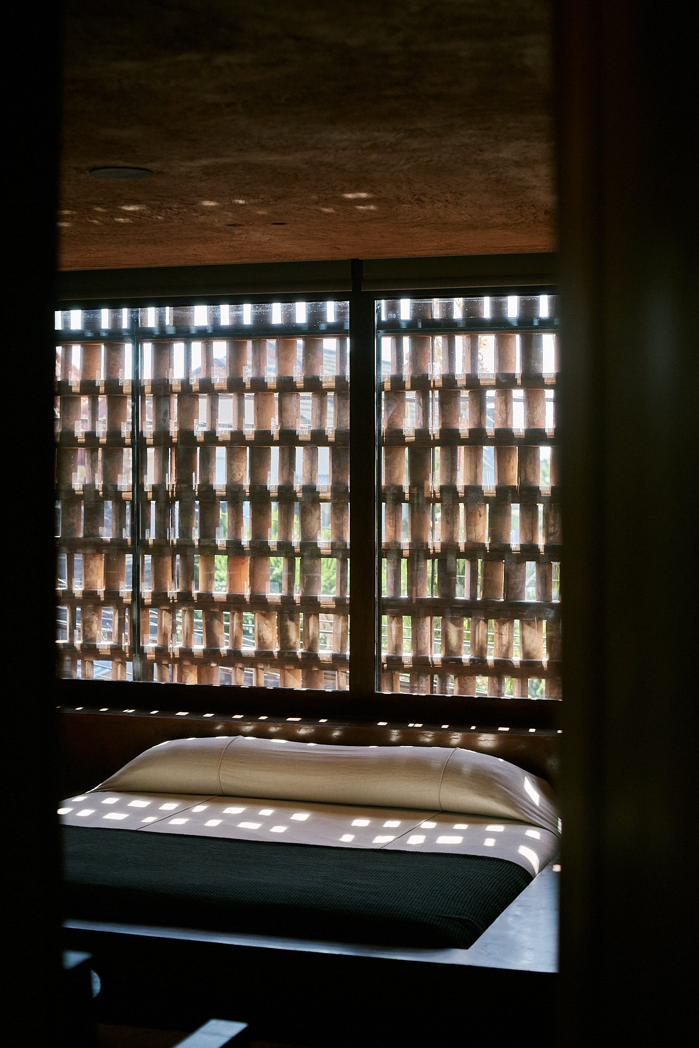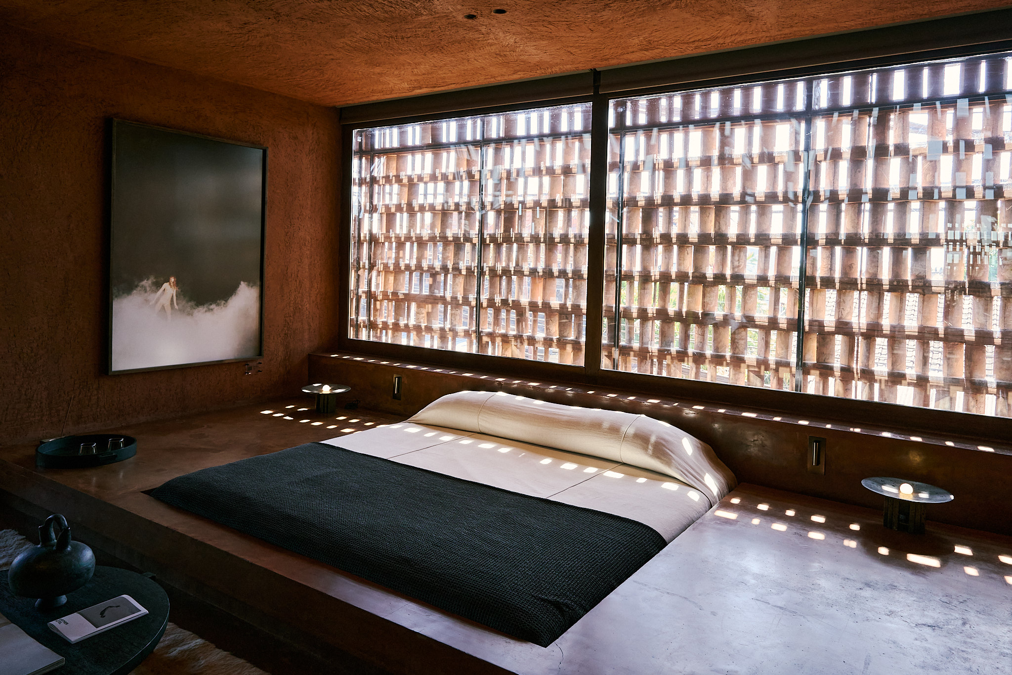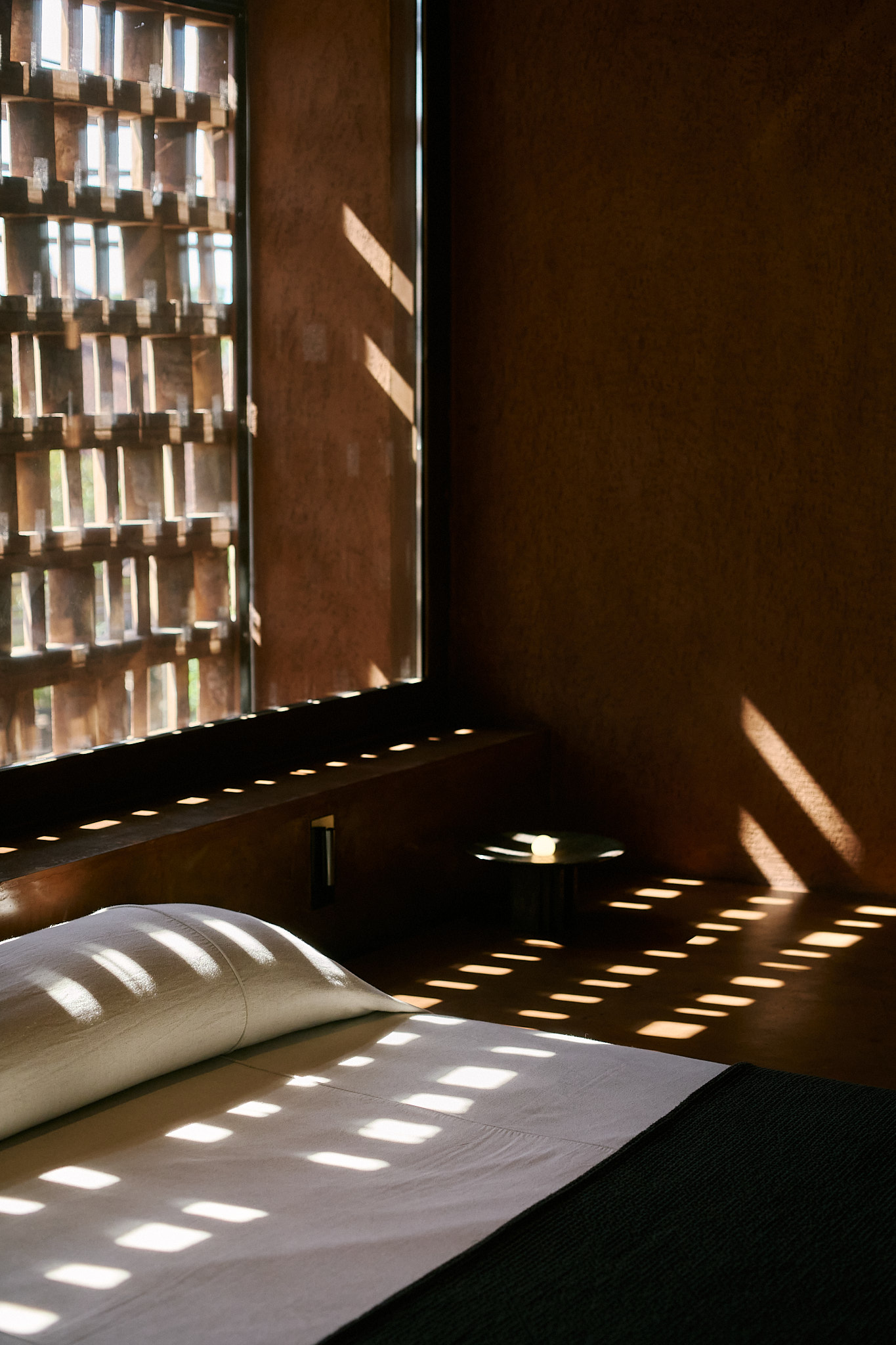 I stayed in the Urban King Suite, and I can honestly say, it’s not just a room, it’s an experience. Everything about it is built to make you slow down and notice. The bed is sunken into the floor, the walls are wrapped in warm-toned plaster, and there’s this motorized roller blind that quietly lifts to reveal soft natural light streaming through the brick lattice. I got way too excited about that detail. The whole space feels like a balance of raw and refined, like it was made for people who appreciate texture as much as comfort. The bathroom was partially open, with filtered light above the shower that made morning showers feel like a ritual. Every texture—leather, timber, concrete—was tactile, calming, and just right.