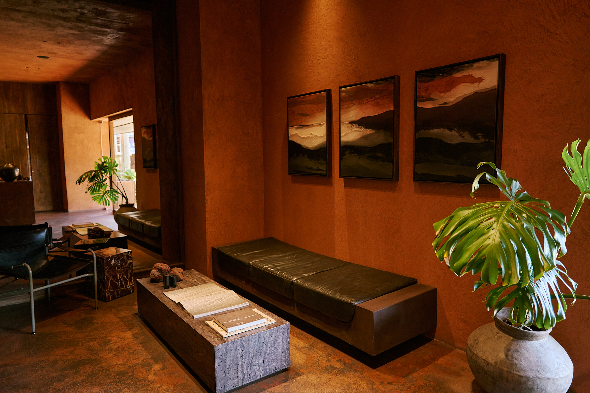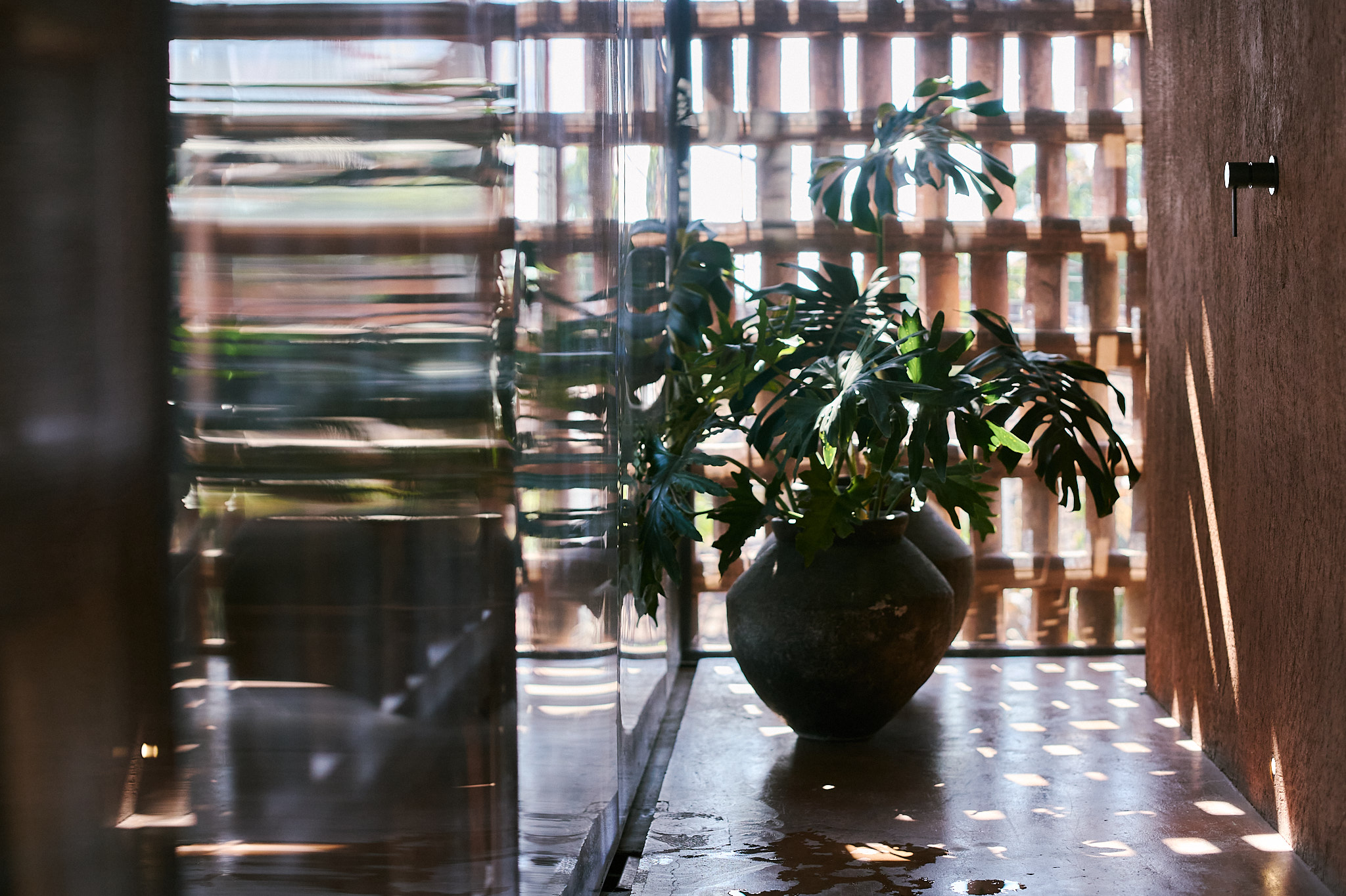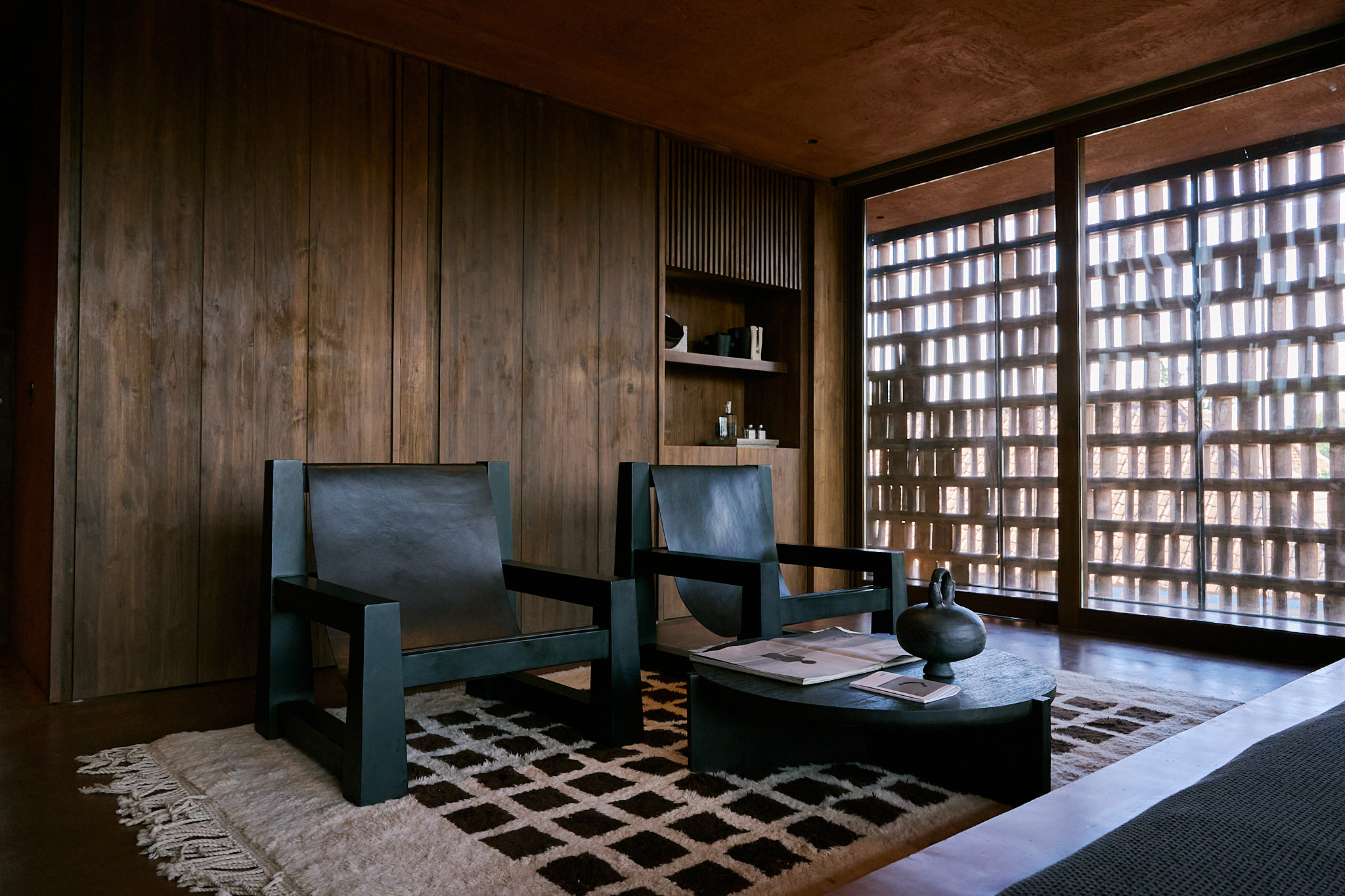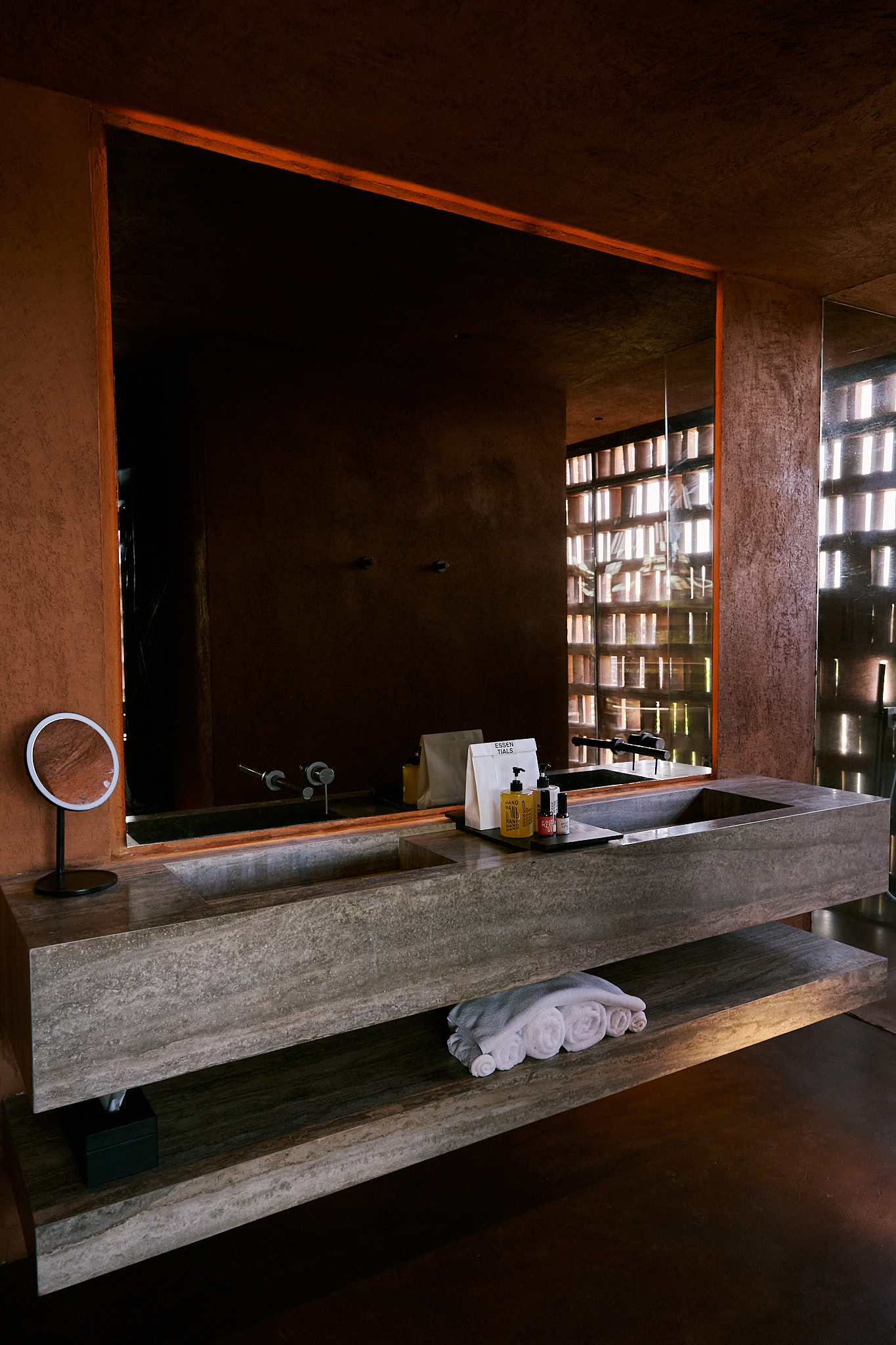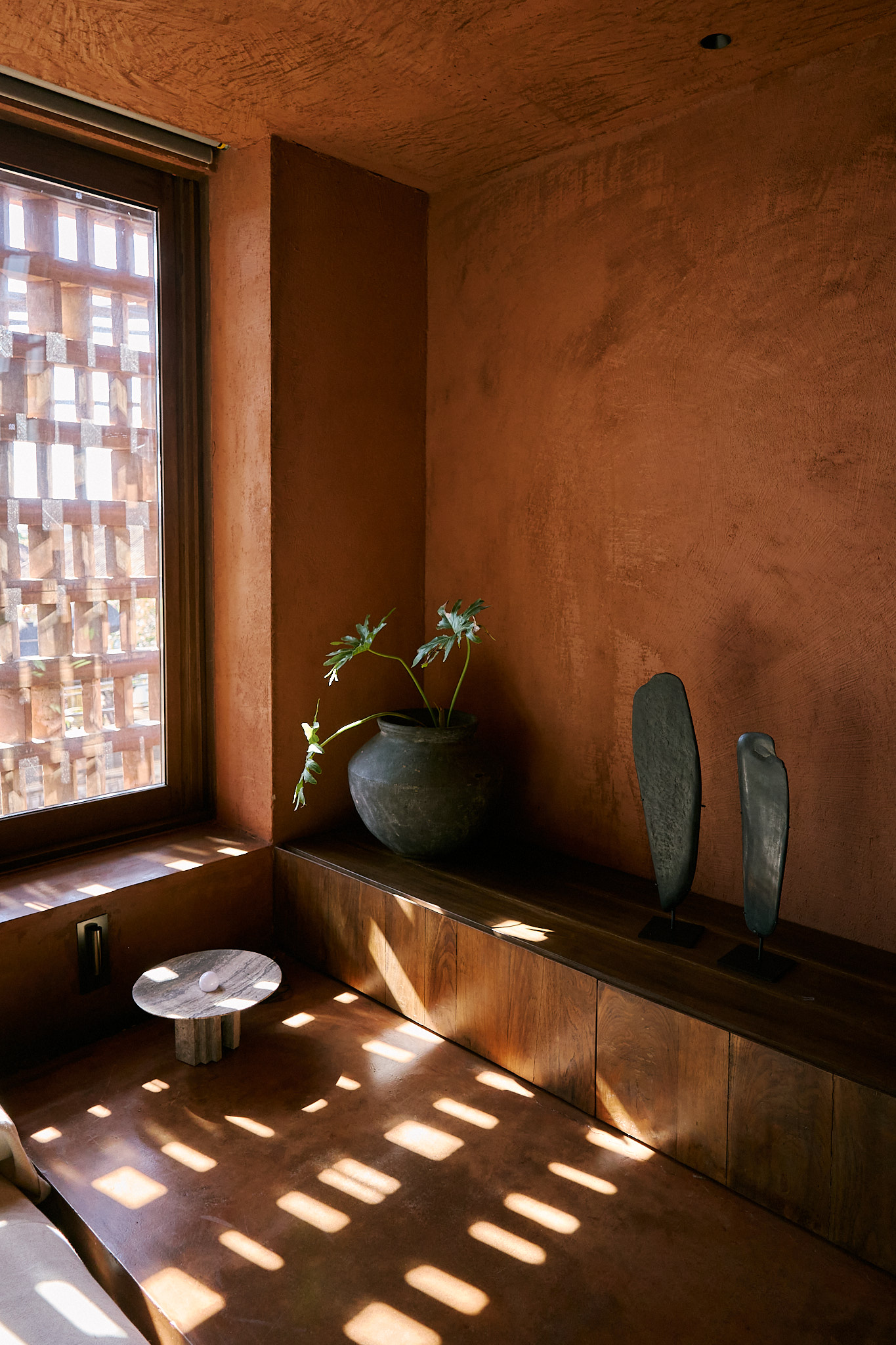I stayed in the Urban King Suite, and I can honestly say, it’s not just a room, it’s an experience. Everything about it is built to make you slow down and notice. The bed is sunken into the floor, the walls are wrapped in warm-toned plaster, and there’s this motorized roller blind that quietly lifts to reveal soft natural light streaming through the brick lattice. I got way too excited about that detail. The whole space feels like a balance of raw and refined, like it was made for people who appreciate texture as much as comfort. The bathroom was partially open, with filtered light above the shower that made morning showers feel like a ritual. Every texture—leather, timber, concrete—was tactile, calming, and just right.
