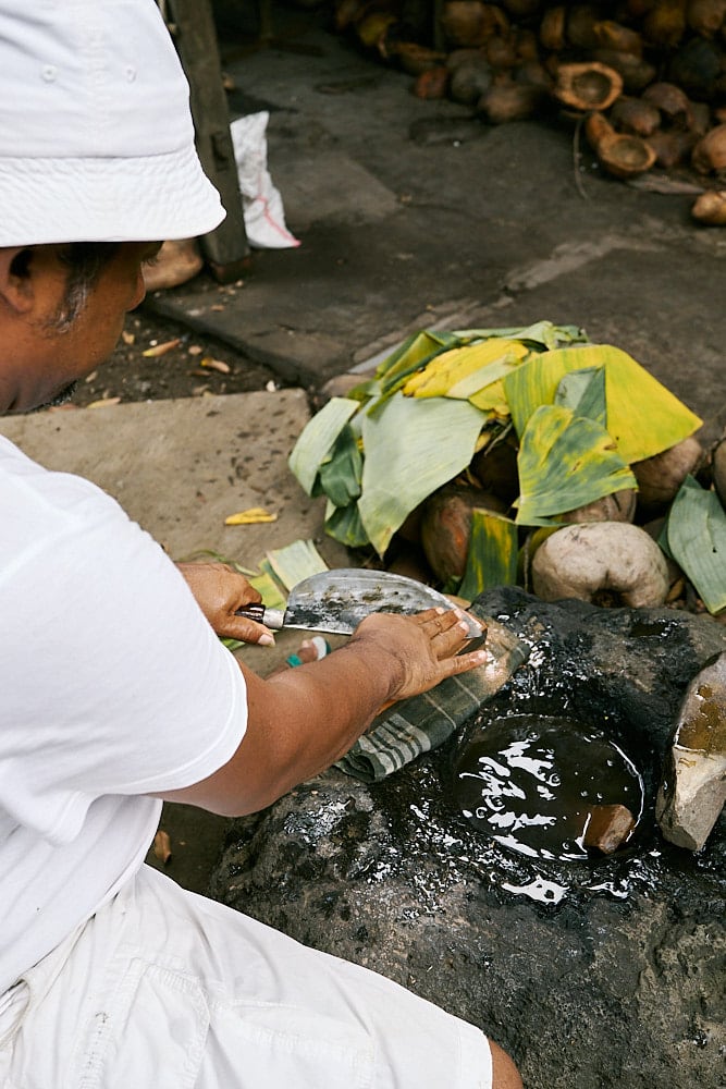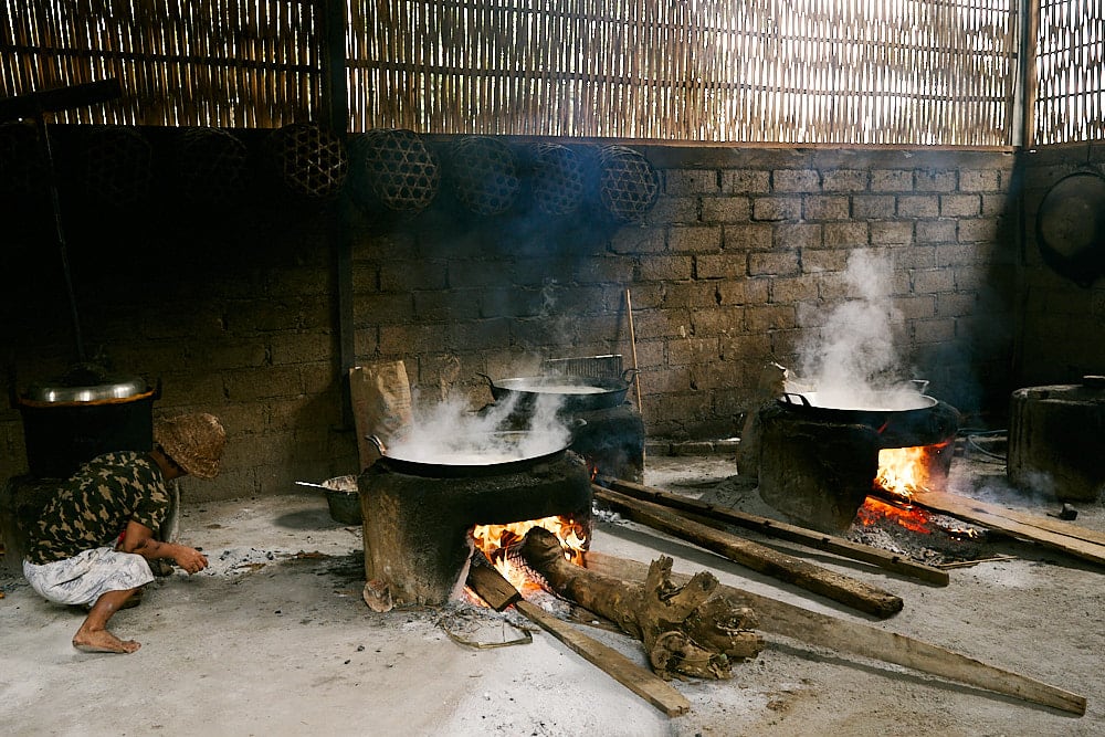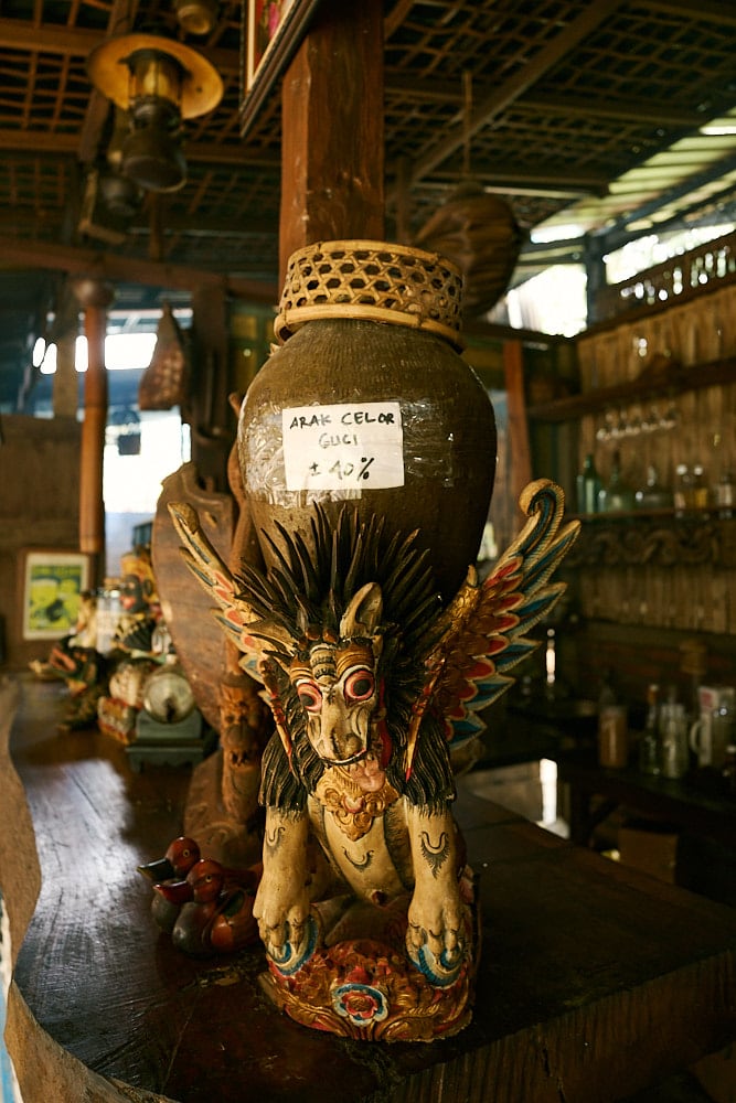 Today, they treat us with amazing food: fish soup with Balinese species, a special Lawar made from Java long pepper leaves, octopus, fish cooked in bamboo, and Barracuda satay. Everything has a special taste. Be careful if you don’t like spicy food because they use quite strong Balinese spices. It may sound like sugar-coating words, but believe me, you need to try it by yourself. After the meals, pak Jero invited us to try the Arak, I really like the “Arak Nangka” They cook the “Nira” with jackfruit wood which makes the Arak slightly have a special aroma.